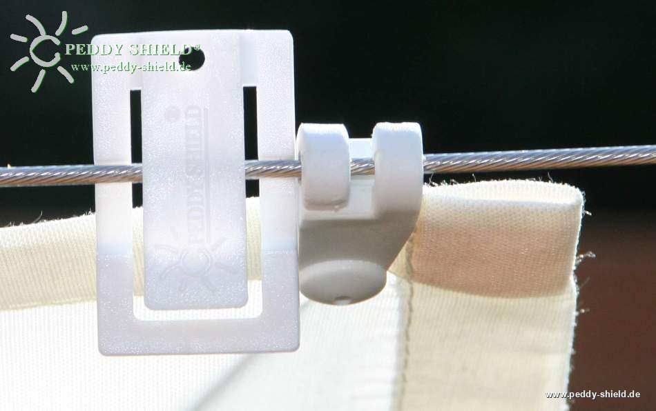 Mantener la posición del toldo: colocar un freno en cada lado del toldo, detrás del primer gancho deslizante. Evita el deslizamiento del toldo de la posición deseada por vientos leves. Permite todavía doblar el toldo para asegurarlo con viento fuerte, sin bloquear el movimiento. Con toldos inclinados impide también el deslizamiento no deseado.